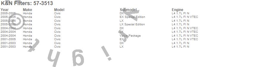 Below is an abbreviated list of applications for the Filtercharger Injection Performance Kit.Civic, Honda, 2005, 2004, 2003, 2002, 2001