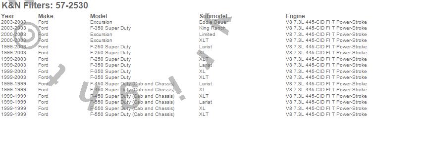 Below is an abbreviated list of applications for the Filtercharger Injection Performance Kit.Excursion, F-250 Super Duty, F-350 Super Duty, F-450 Super Duty, F-550 Super Duty, Ford, 2003, 2002, 2001, 2000, 1999