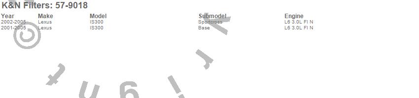 Below is an abbreviated list of applications for the Filtercharger Injection Performance Kit.IS300, Lexus, 2005, 2004, 2003, 2002, 2001