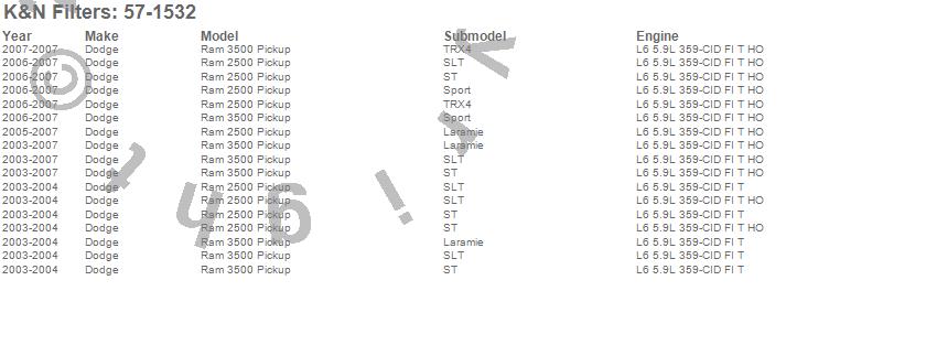 Below is an abbreviated list of applications for the Filtercharger Injection Performance Kit.Ram 2500, Ram 3500, Dodge, 2007, 2006, 2005, 2004, 2003
