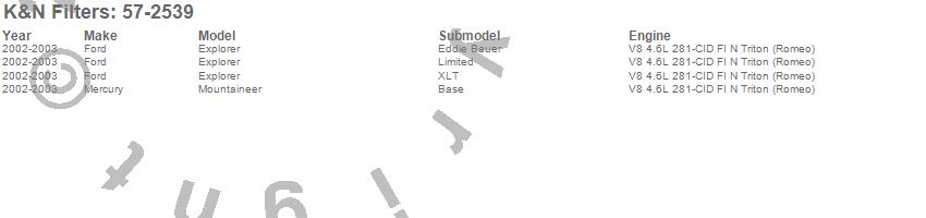 Below is an abbreviated list of applications for the Filtercharger Injection Performance Kit.Explorer, Mountaineer, Ford, Mercury, 2003, 2002