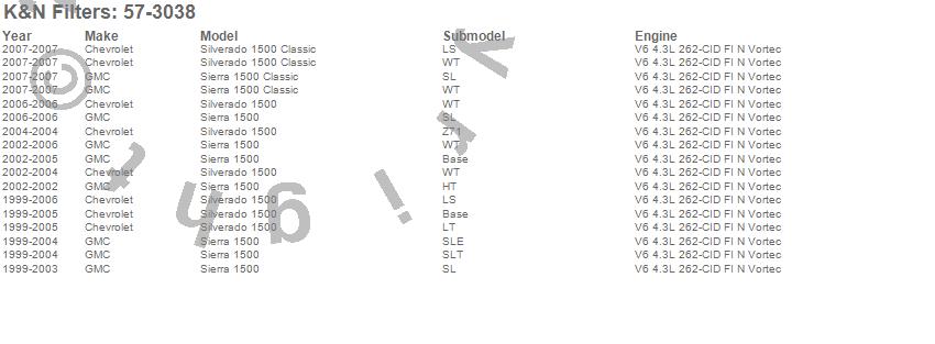Below is an abbreviated list of applications for the Filtercharger Injection Performance Kit.Sierra 1500, Sierra 1500 Classic, Silverado 1500, Silverado 1500 Classic, Chevrolet, GMC, 2007, 2006, 2005, 2004, 2003, 2002, 2001, 2000, 1999