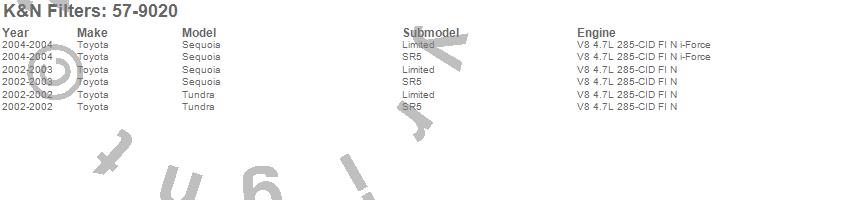 Below is an abbreviated list of applications for the Filtercharger Injection Performance Kit.Sequoia, Tundra, Toyota, 2004, 2003, 2002