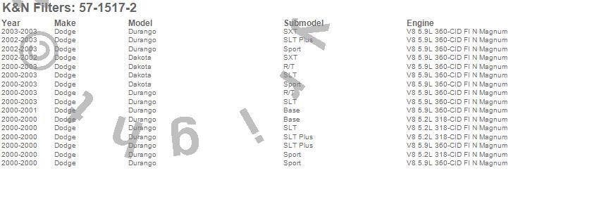 Below is an abbreviated list of applications for the Filtercharger Injection Performance Kit.Dakota, Durango, Dodge, 2003, 2002, 2001, 2000