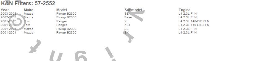 Below is an abbreviated list of applications for the Filtercharger Injection Performance Kit.B2300, Ranger, Ford, Mazda, 2003, 2002, 2001