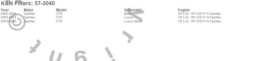 Below is an abbreviated list of applications for the Filtercharger Injection Performance Kit.CTS, Cadillac, 2004, 2003