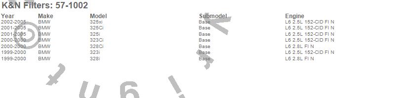 Below is an abbreviated list of applications for the Filtercharger Injection Performance Kit.323Ci, 323i, 325Ci, 325i, 325xi, 328Ci, 328i, BMW, 2005, 2004, 2003, 2002, 2001, 2000, 1999