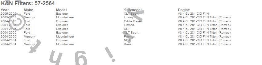 Below is an abbreviated list of applications for the Filtercharger Injection Performance Kit.Explorer, Mountaineer, Ford, Mercury, 2005, 2004