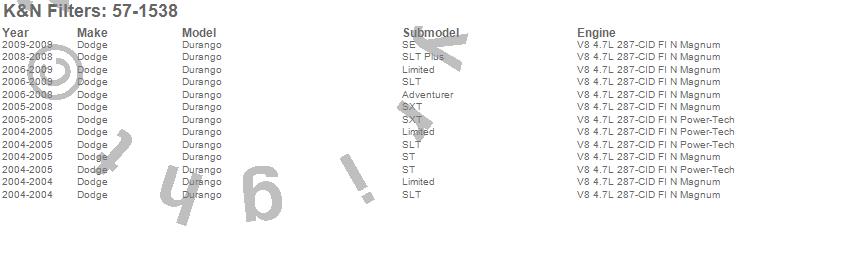 Below is an abbreviated list of applications for the Filtercharger Injection Performance Kit.Durango, Dodge, 2009, 2008, 2007, 2006, 2005, 2004