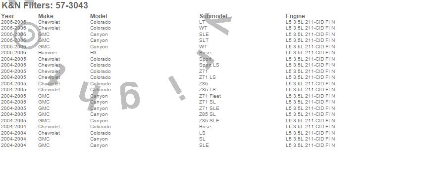 Below is an abbreviated list of applications for the Filtercharger Injection Performance Kit.Canyon, Colorado, H3, Chevrolet, GMC, Hummer, 2006, 2005, 2004