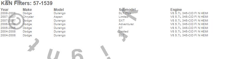 Below is an abbreviated list of applications for the Filtercharger Injection Performance Kit.Aspen, Durango, Chrysler, Dodge, 2008, 2007, 2006, 2005, 2004