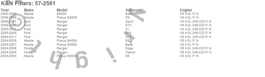 Below is an abbreviated list of applications for the Filtercharger Injection Performance Kit.B4000, Ranger, Ford, Mazda, 2011, 2010, 2009, 2008, 2007, 2006, 2005, 2004
