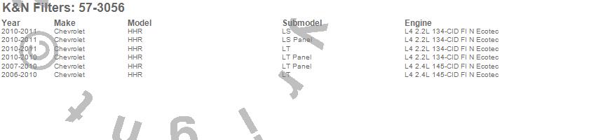 Below is an abbreviated list of applications for the Filtercharger Injection Performance Kit.HHR, Chevrolet, 2011, 2010, 2009, 2008, 2007, 2006