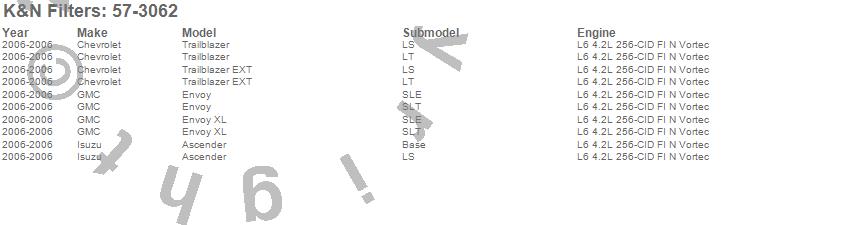 Below is an abbreviated list of applications for the Filtercharger Injection Performance Kit.Ascender, Envoy, Envoy XL, Trailblazer, Trailblazer EXT, Chevrolet, GMC, Isuzu, 2006