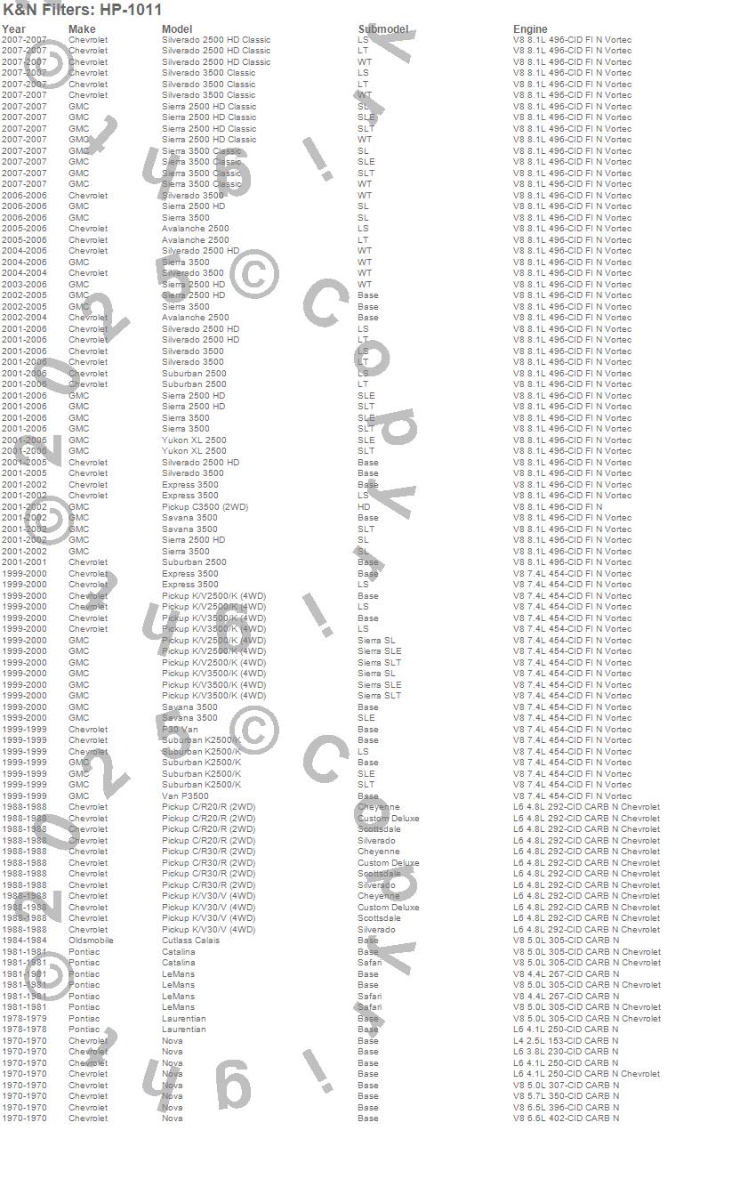Below is an abbreviated list of applications for the Performance Gold Oil Filter.Avalanche 2500, C3500 Pickup, Catalina, Cutlass Calais, Express 3500, K2500 Pickup, K2500 Suburban, K3500 Pickup, Laurentian, LeMans, Nova, P30 Van, P3500 Van, R20 Pickup, R30 Pickup, Savana 3500, Sierra 2500 HD, Sierra 2500 HD Classic, Sierra 3500, Sierra 3500 Classic