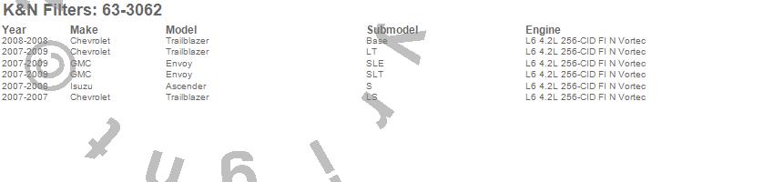 Below is an abbreviated list of applications for the 63 Series Aircharger Kit.Ascender, Envoy, Trailblazer, Chevrolet, GMC, Isuzu, 2009, 2008, 2007
