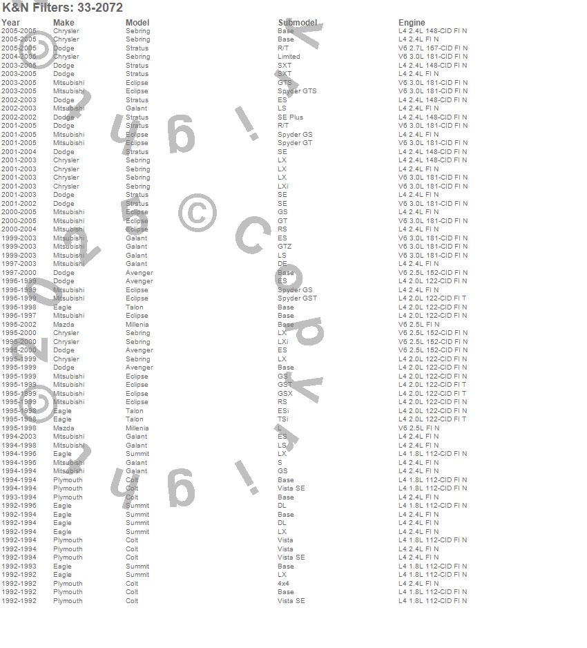 Below is an abbreviated list of applications for the Air Filter.Avenger, Colt, Eclipse, Galant, Millenia, Sebring, Stratus, Summit, Talon, Chrysler, Dodge, Eagle, Mazda, Mitsubishi, Plymouth, 2005, 2004, 2003, 2002, 2001