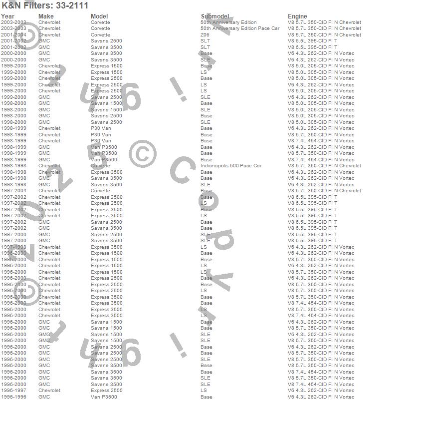 Below is an abbreviated list of applications for the Air Filter.Corvette, Express 1500, Express 2500, Express 3500, P30 Van, P3500 Van, Savana 1500, Savana 2500, Savana 3500, Chevrolet, GMC, 2004, 2003, 2002, 2001, 2000, 1999, 1998, 1997, 1996