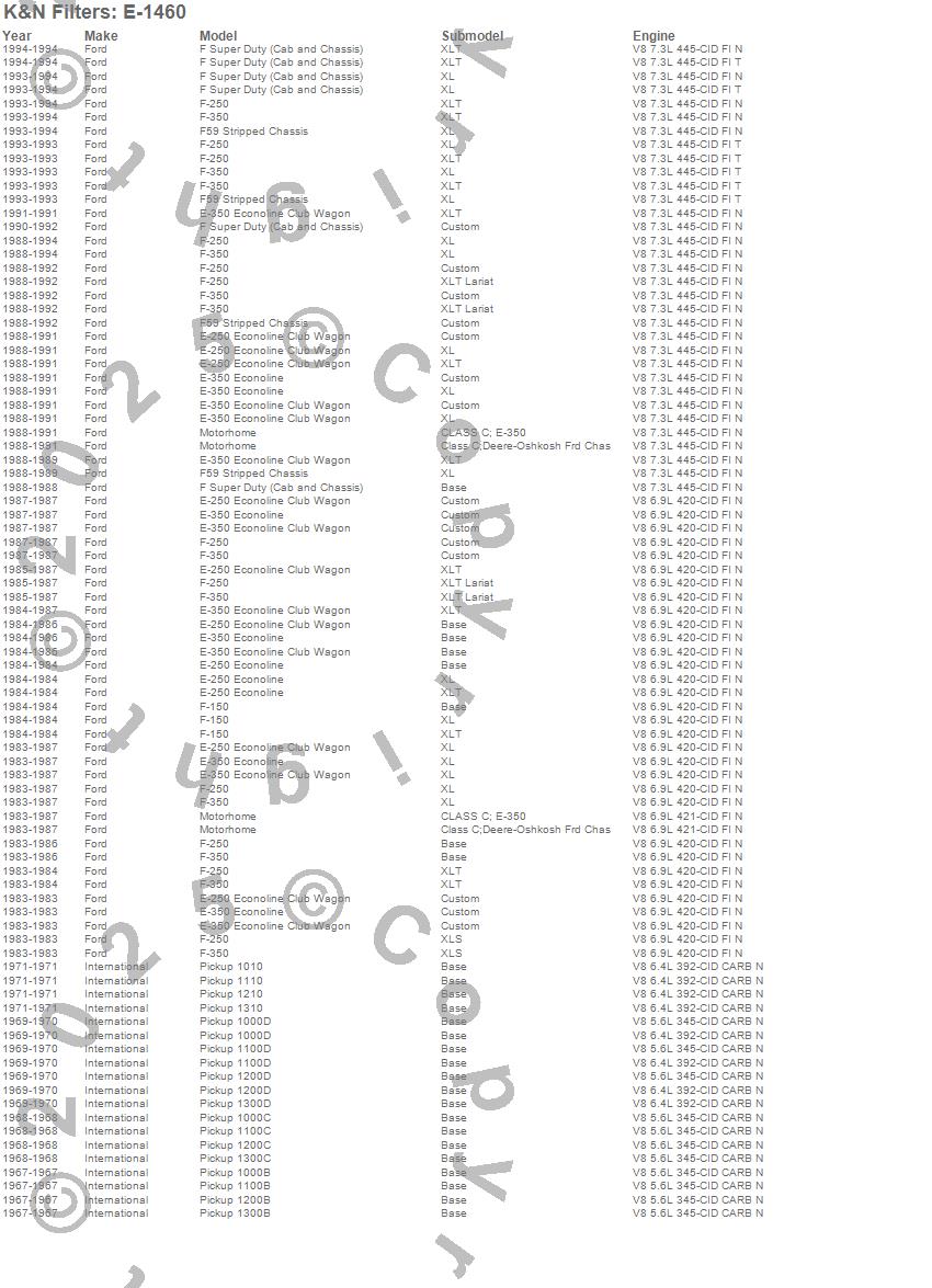 Below is an abbreviated list of applications for the Air Filter.E-250 Econoline, E-250 Econoline Club Wagon, E-350 Econoline, E-350 Econoline Club Wagon, F Super Duty, F-150, F-250, F-350, F59, Motorhome, Pickup 1000B, Pickup 1000C, Pickup 1000D, Pickup 1010, Pickup 1100B, Pickup 1100C, Pickup 1100D, Pickup 1110, Pickup 1200B, Pickup 1200C