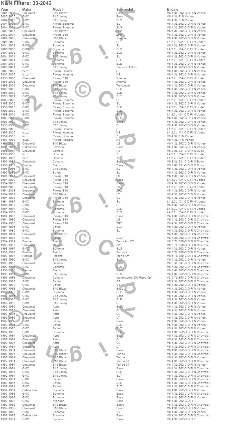 Below is an abbreviated list of applications for the Air Filter.Astro, Bravada, Camaro, Firebird, Hombre, S10 Blazer, S10 Pickup, S15 Jimmy, Safari, Sonoma, Syclone, Typhoon, Chevrolet, GMC, Isuzu, Oldsmobile, Pontiac, 2005, 2004, 2003