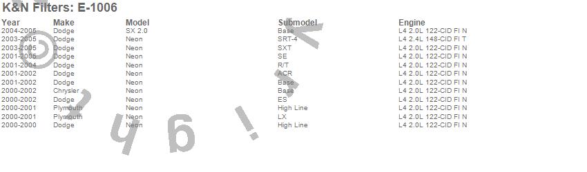 Below is an abbreviated list of applications for the Air Filter.Neon, SX 2.0, Chrysler, Dodge, Plymouth, 2005, 2004, 2003, 2002, 2001, 2000
