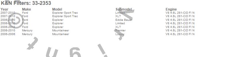 Below is an abbreviated list of applications for the Air Filter.Explorer, Explorer Sport Trac, Mountaineer, Ford, Mercury, 2010, 2009, 2008, 2007, 2006