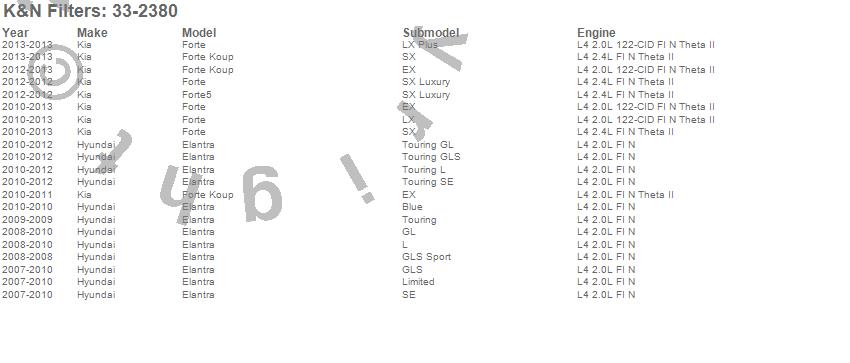 Below is an abbreviated list of applications for the Air Filter.Elantra, Forte, Forte Koup, Forte5, Hyundai, Kia, 2013, 2012, 2011, 2010, 2009, 2008, 2007