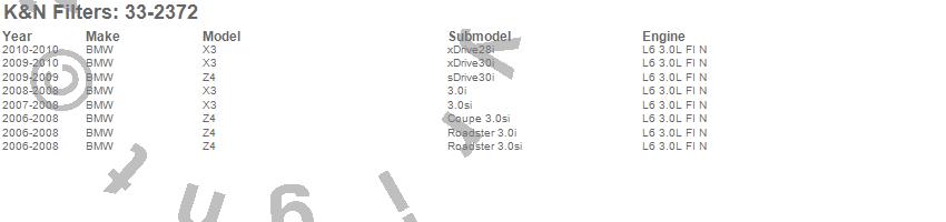 Below is an abbreviated list of applications for the Air Filter.X3, Z4, BMW, 2010, 2009, 2008, 2007, 2006