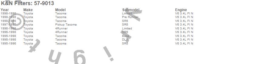 Below is an abbreviated list of applications for the Filtercharger Injection Performance Kit.4Runner, Tacoma, Toyota, 1998, 1997, 1996, 1995