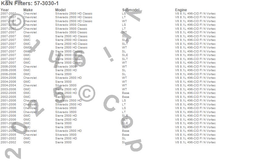 Below is an abbreviated list of applications for the Filtercharger Injection Performance Kit.Sierra 2500 HD, Sierra 2500 HD Classic, Sierra 3500, Sierra 3500 Classic, Silverado 2500 HD, Silverado 2500 HD Classic, Silverado 3500, Silverado 3500 Classic, Chevrolet, GMC, 2007, 2006, 2005, 2004, 2003, 2002, 2001