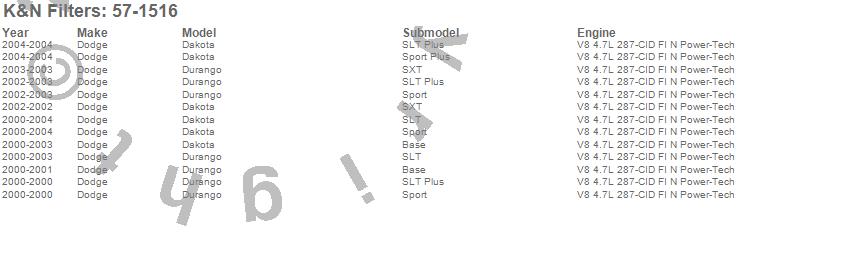 Below is an abbreviated list of applications for the Filtercharger Injection Performance Kit.Dakota, Durango, Dodge, 2004, 2003, 2002, 2001, 2000