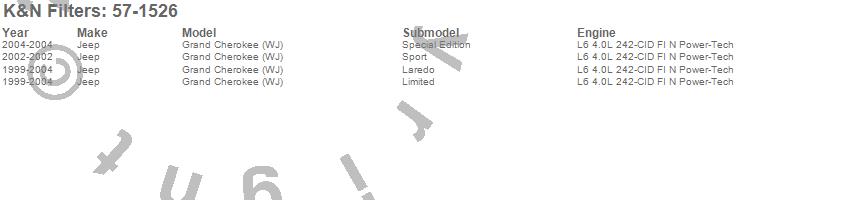Below is an abbreviated list of applications for the Filtercharger Injection Performance Kit.Grand Cherokee, Jeep, 2004, 2003, 2002, 2001, 2000, 1999