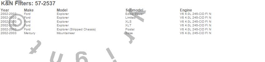Below is an abbreviated list of applications for the Filtercharger Injection Performance Kit.Explorer, Explorer (Stripped Chassis), Mountaineer, Ford, Mercury, 2003, 2002