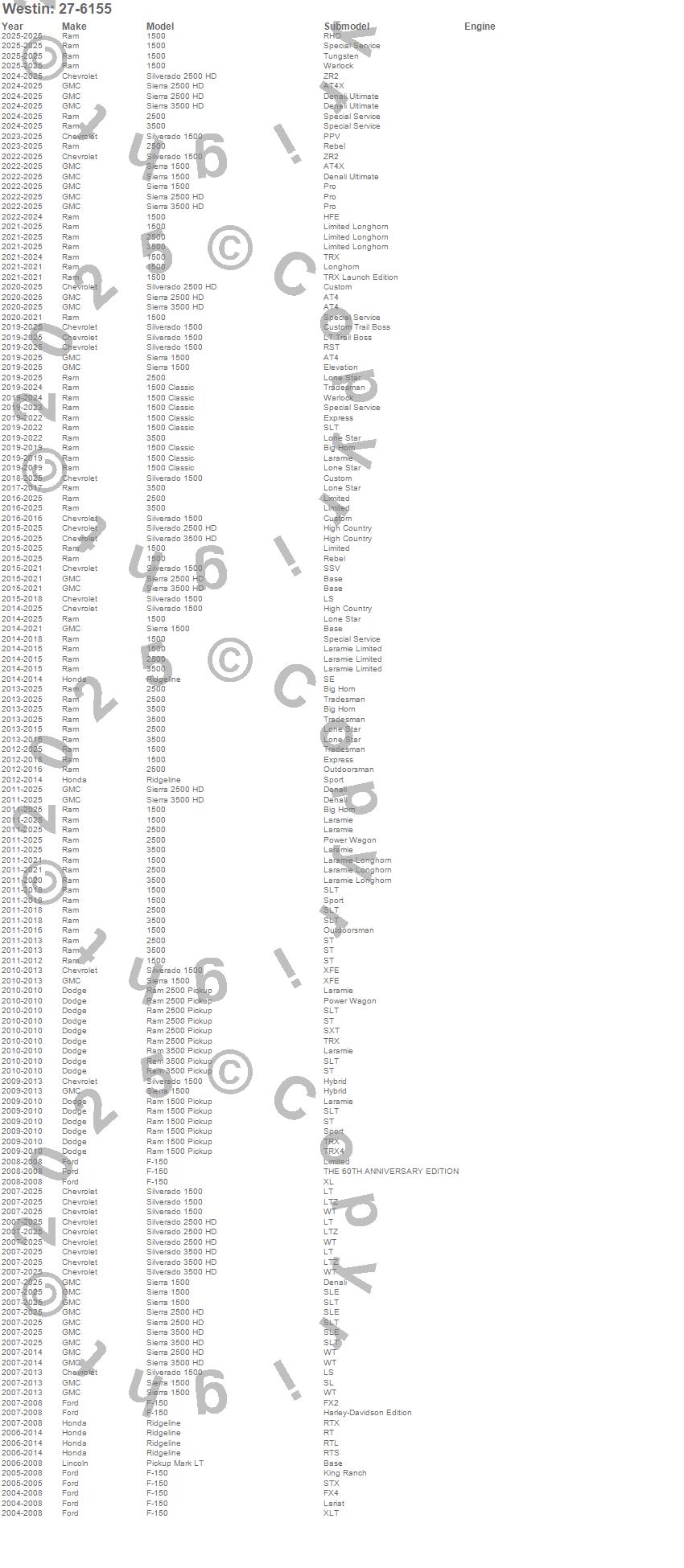 Brand: WestinPart Number: 27-6155Running Board Type: Black Aluminum - 85 in. Length - Does Not Include Mount Kit - Vehicle Specific Mount Kit Must Be Purchased SeparatelyUPC: 707742016282