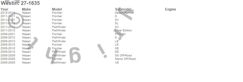 Below is an abbreviated list of applications for the Running Board Mount Kit.Frontier, Pathfinder, Nissan, 2021, 2020, 2019, 2018, 2017, 2016, 2015, 2014, 2013, 2012, 2011, 2010, 2009, 2008, 2007, 2006, 2005
