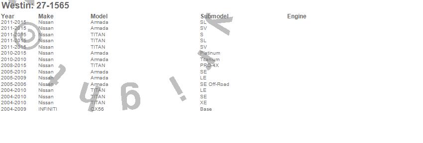 Below is an abbreviated list of applications for the Running Board Mount Kit.Armada, QX56, TITAN, INFINITI, Nissan, 2015, 2014, 2013, 2012, 2011, 2010, 2009, 2008, 2007, 2006, 2005, 2004