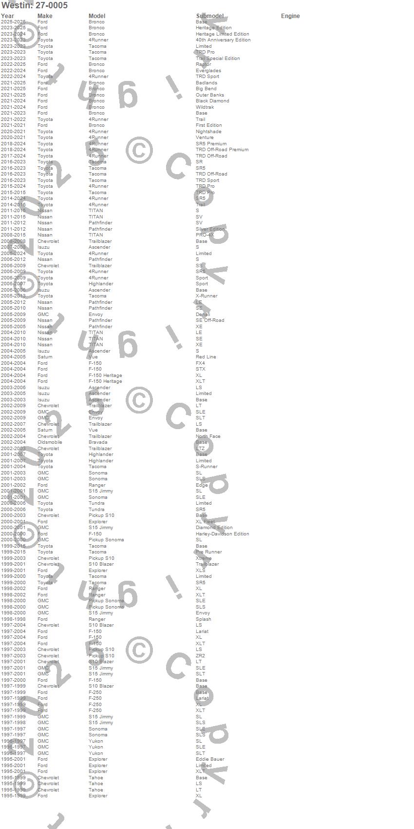 Brand: WestinPart Number: 27-0005Running Board Type: Lighted - 72 in. Board - Black Molded Plastic - Does Not Include Mount Kit - Vehicle Specific Mount Kit Must Be Purchased SeparatelyUPC: 707742500057