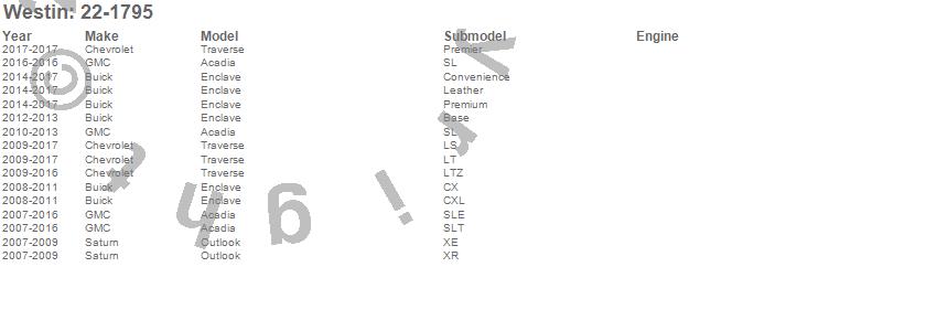 Below is an abbreviated list of applications for the Premier Oval Nerf Step Bar Mount Kit.Acadia, Enclave, Outlook, Traverse, Buick, Chevrolet, GMC, Saturn, 2017, 2016, 2015, 2014, 2013, 2012, 2011, 2010, 2009, 2008, 2007