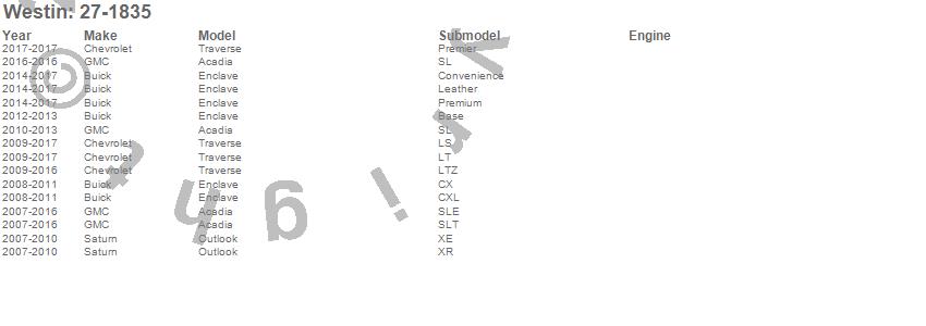 Below is an abbreviated list of applications for the Running Board Mount Kit.Acadia, Enclave, Outlook, Traverse, Buick, Chevrolet, GMC, Saturn, 2017, 2016, 2015, 2014, 2013, 2012, 2011, 2010, 2009, 2008, 2007