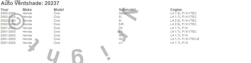 Below is an abbreviated list of applications for the Carflector Stone/Bug Deflector.Civic, Honda, 2003, 2002, 2001