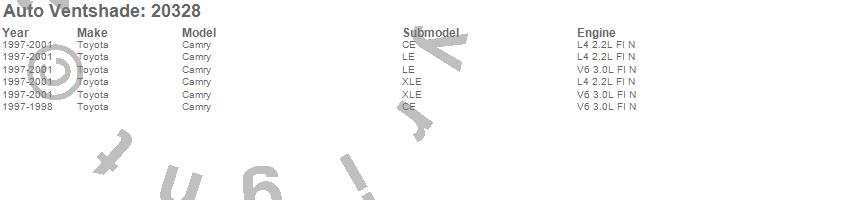 Below is an abbreviated list of applications for the Carflector Stone/Bug Deflector.Camry, Toyota, 2001, 2000, 1999, 1998, 1997