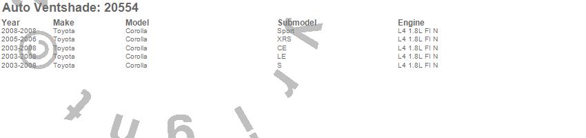 Below is an abbreviated list of applications for the Carflector Stone/Bug Deflector.Corolla, Toyota, 2008, 2007, 2006, 2005, 2004, 2003