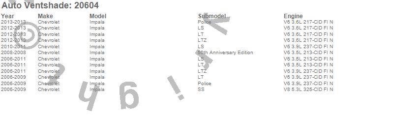 Below is an abbreviated list of applications for the Carflector Stone/Bug Deflector.Impala, Chevrolet, 2013, 2012, 2011, 2010, 2009, 2008, 2007, 2006
