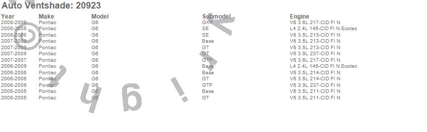 Below is an abbreviated list of applications for the Carflector Stone/Bug Deflector.G6, Pontiac, 2009, 2008, 2007, 2006, 2005