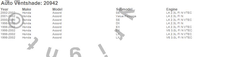 Below is an abbreviated list of applications for the Carflector Stone/Bug Deflector.Accord, Honda, 2002, 2001, 2000, 1999, 1998