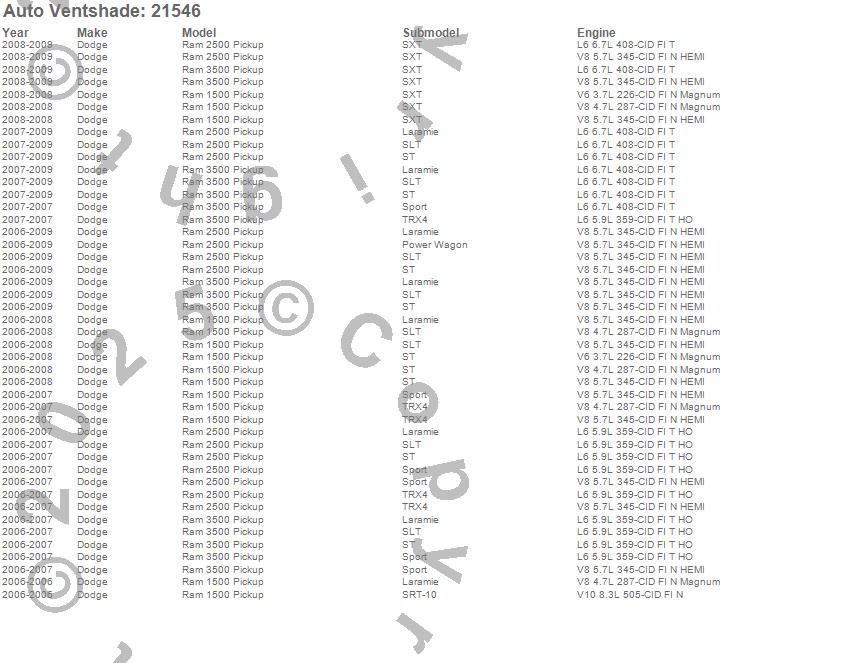 Below is an abbreviated list of applications for the Hoodflector Hood Protector.Ram 1500, Ram 2500, Ram 3500, Dodge, 2009, 2008, 2007, 2006
