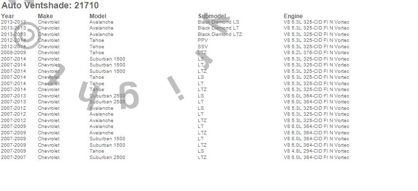 Below is an abbreviated list of applications for the Hoodflector Hood Protector.Avalanche, Suburban 1500, Suburban 2500, Tahoe, Chevrolet, 2014, 2013, 2012, 2011, 2010, 2009, 2008, 2007