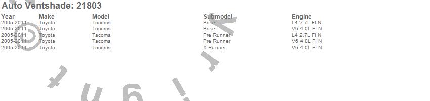 Below is an abbreviated list of applications for the Hoodflector Hood Protector.Tacoma, Toyota, 2011, 2010, 2009, 2008, 2007, 2006, 2005