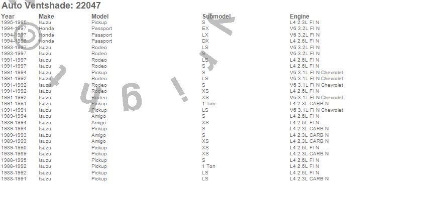 Below is an abbreviated list of applications for the Bugflector Stone/Bug Deflector.Amigo, Passport, Pickup, Rodeo, Honda, Isuzu, 1997, 1996, 1995, 1994, 1993, 1992, 1991, 1990, 1989, 1988