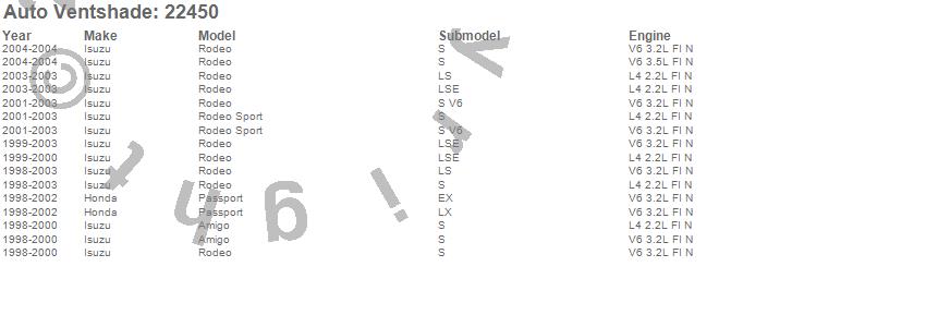 Below is an abbreviated list of applications for the Bugflector Stone/Bug Deflector.Amigo, Passport, Rodeo, Rodeo Sport, Honda, Isuzu, 2004, 2003, 2002, 2001, 2000, 1999, 1998